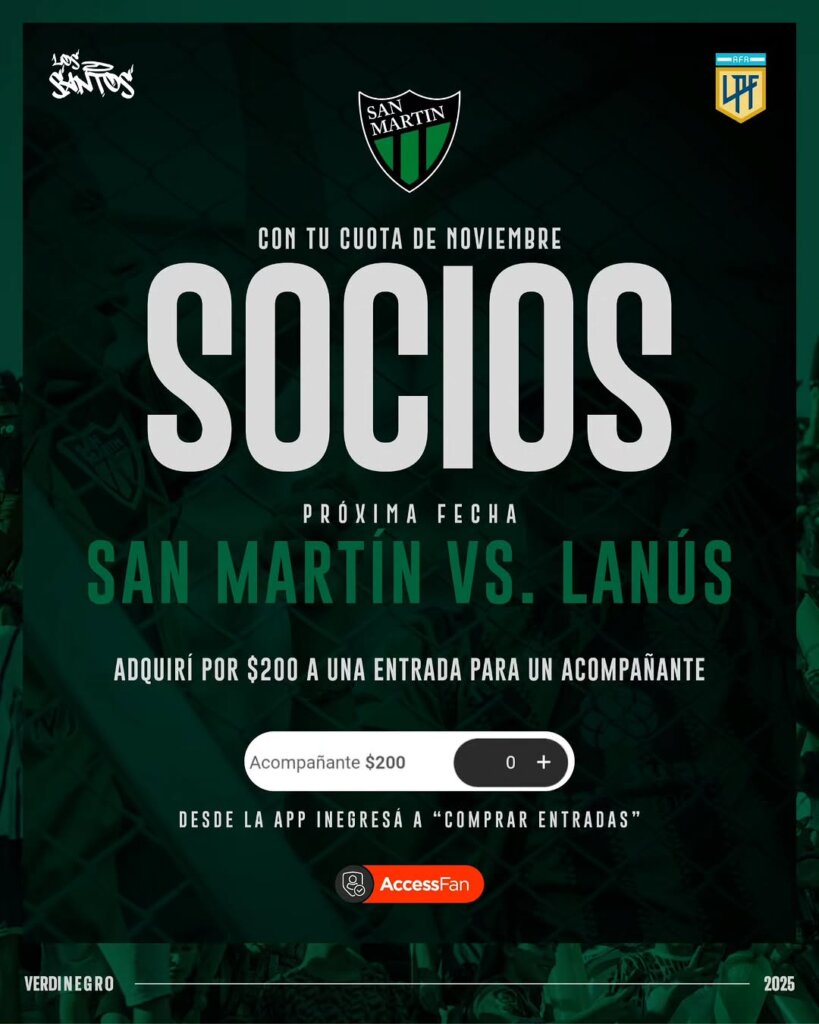 El Club Atlético San Martín anunció un nuevo beneficio para sus socios que tengan al día la cuota del mes de noviembre. De cara a la próxima fecha, en la que el Verdinegro recibirá a Lanús, los socios podrán adquirir una entrada adicional para un acompañante por solo $200.