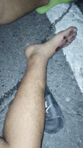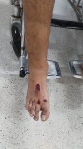 Hugo tiene quebraduras en uno de sus pies y golpes en diferentes partes del cuerpo, se encuentra internado en el hospital Rawson fue visitado por la Concejal Elizabeth Sanchez quien contuvo a la familia y le consiguió muletas para su rehabilitación.