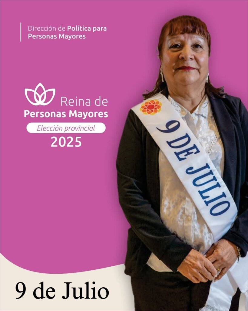El departamento 9 de Julio estará representado por Angélica Reina Ochova en la elección provincial de la Reina de Personas Mayores 2025, que se realizará este miércoles 15 de octubre, desde las 18 horas, en el Estadio Aldo Cantoni.