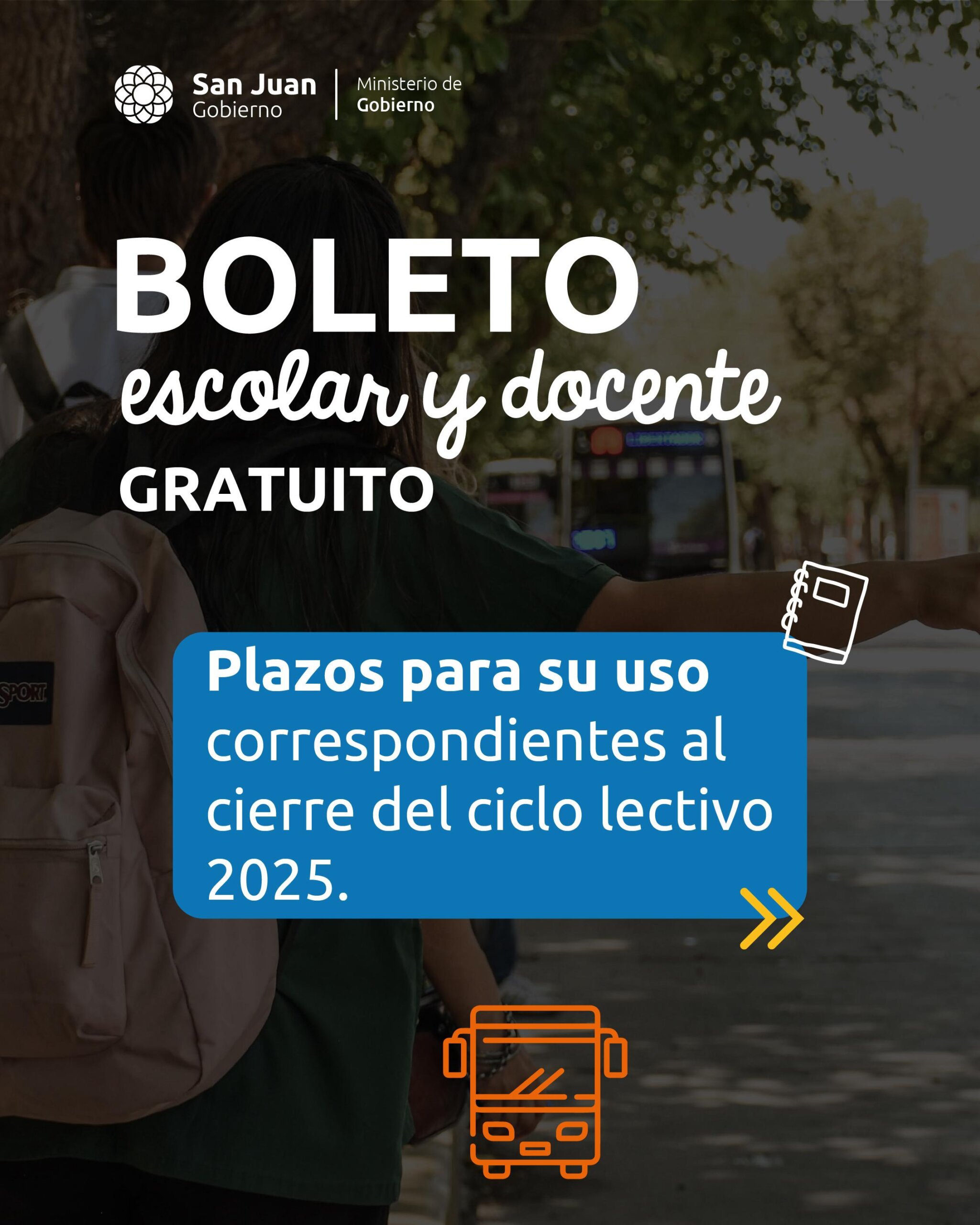 El Ministerio de Gobierno informa a la comunidad educativa que se han establecido los plazos de utilización del Boleto Escolar y Docente Gratuito correspondientes al cierre del ciclo lectivo 2025. En el caso de los estudiantes, el beneficio podrá utilizarse hasta el 19 de diciembre de 2025, mientras que los docentes que cuenten con credencial tendrán plazo de uso hasta el 29 de diciembre inclusive, según lo informado por el Ministerio de Educación. Desde el Ministerio se recuerda que este programa tiene como objetivo acompañar a estudiantes, docentes y familias sanjuaninas, garantizando el acceso a la educación mediante un servicio de transporte gratuito, seguro y ordenado. Se solicita a la comunidad tener en cuenta estas fechas para una correcta planificación de traslados durante el cierre del año escolar.