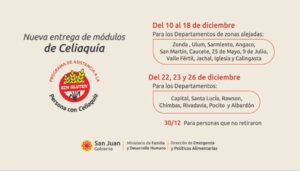 Este programa busca asegurar el acceso a productos libres de gluten, promoviendo una alimentación adecuada y acompañando a quienes requieren una dieta específica por razones de salud. Asimismo, se comunica que los departamentos de Valle Fértil e Iglesia ya recibieron la entrega correspondiente al mes en curso, garantizando así la continuidad del apoyo alimentario en dichas localidades.