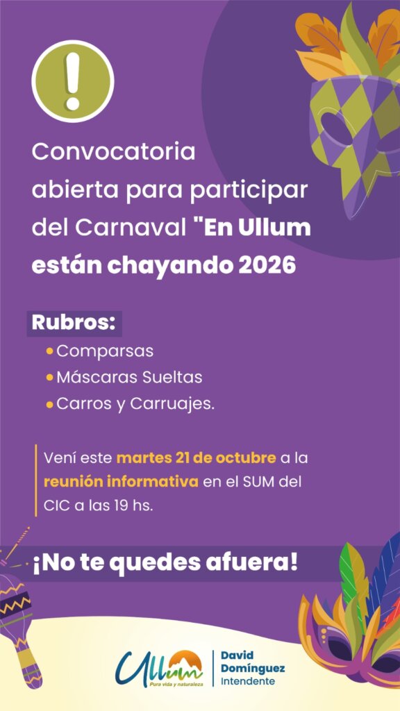 La Municipalidad de Ullum invita a participar del Carnaval 2026, una de las celebraciones más esperadas por toda la comunidad. Este martes 21/10 en el SUM del CIC a las 19 hs  reunión informativa.