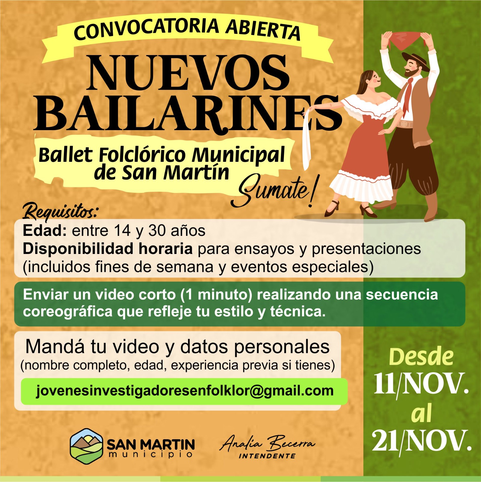 La Municipalidad de San Martín abre la convocatoria para sumar nuevos bailarines al Ballet Folclórico Municipal, un elenco que representa con orgullo la identidad y las tradiciones de nuestro departamento.