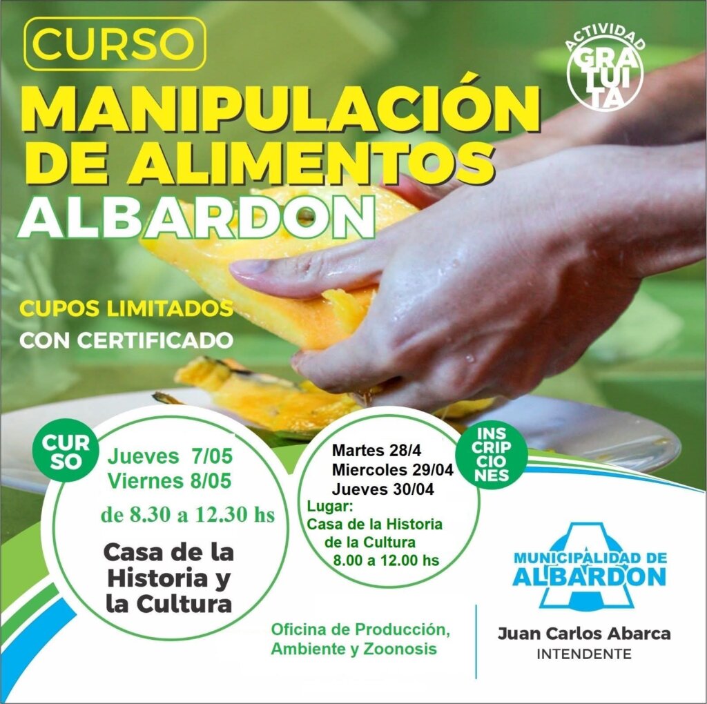 Las inscripciones para el curso de Manipulación de Alimentos en Albardón serán en la fecha del martes 28 , miércoles 29 y jueves 30 de abril en horario de 8 a 12 horas en la Casa de la Historia y la Cultura Parque Latinoamericano Albardón.