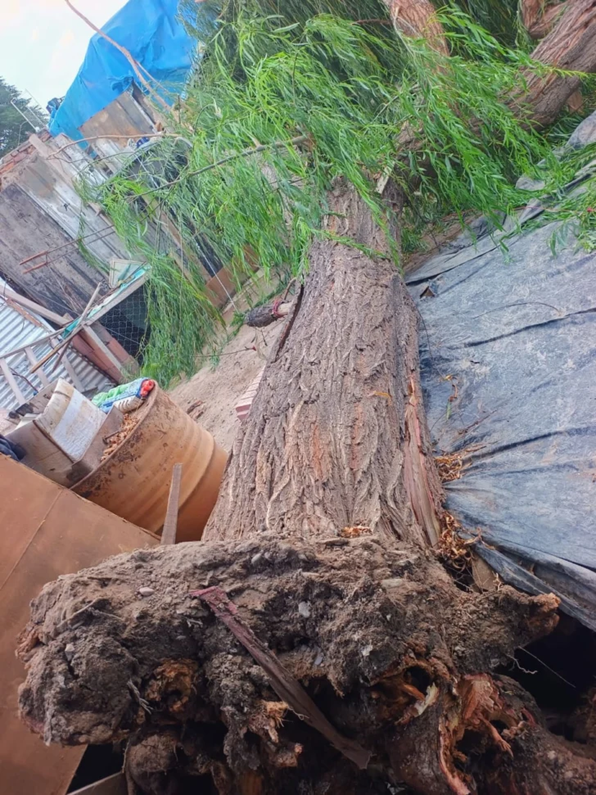 El hecho ocurrió alrededor de las 19:30, luego de que intensas ráfagas provenientes del cuadrante sur provocaran el desplome de un sauce de aproximadamente 50 años. El árbol cayó sobre una casa ubicada en calle Candallo s/n, en Villa 12 de Octubre, afectando la estructura del techo y obstruyendo por completo las entradas y salidas del inmueble.