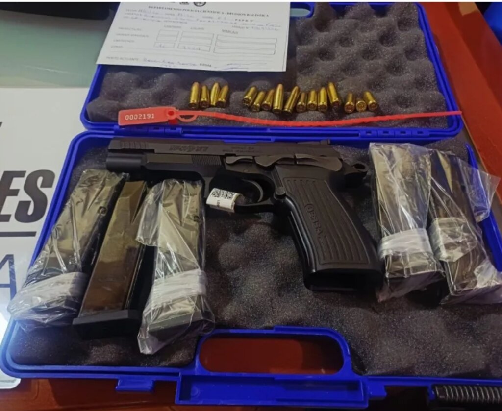 Entre los elementos incautados se encuentran una pistola calibre 9 milímetros marca Bersa TPR9XT con dos cargadores y 16 cartuchos del mismo calibre; una pistola calibre .45 marca Glock con dos cargadores y 23 cartuchos; un fusil marca Colt calibre .22 largo; 167 cartuchos calibre .22 largo; un aire comprimido tipo fusil marca Kral Arms calibre 5.5 milímetros y un pistolón marca Boito junto a 24 cartuchos calibre 14.