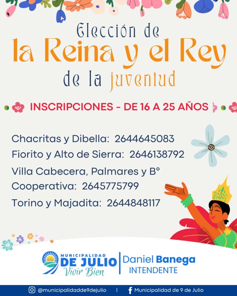 La Municipalidad de 9 de Julio informa que ya se están realizando inscripciones para la elección de la Reina y el Rey de la Juventud. Hay tiempo hasta la mañana de este jueves 2 de octubre.