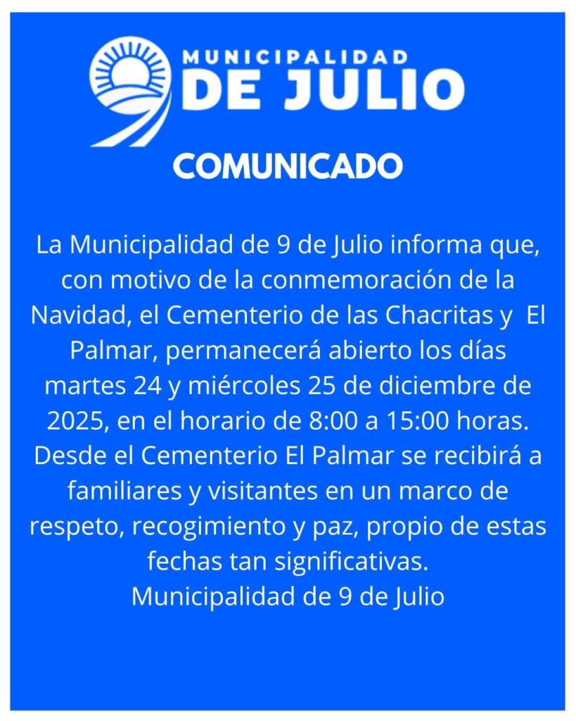 La Municipalidad de 9 de Julio informó que los cementerios de Las Chacritas y El Palmar abrirán al público el 24 y 25 de diciembre de 2025, en el horario de 8 a 15 horas, para que los vecinos puedan rendir homenaje a sus seres queridos durante la Navidad, en un marco de respeto y recogimiento.