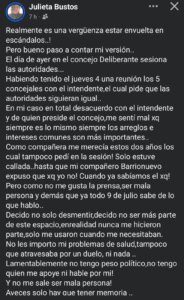 Hacen unos días este diario levanto una nota respecto a la situación, que según la ley se debía dirimir en el ámbito del concejo deliberante, Al parecer el intendente Banega mantuvo una reunión con los 5 concejales dentro del anonimato, sin hacerlo publico, ni tampoco se conoció el motivo de la reunión, esto surgió por el inconveniente que se dio en el recinto con la elección de la presidencia la cual el propio intendente es quien pidió al parecer, que siga Sanchez y esto fue total detonante para que Julieta se sienta defraudada por Banega y pego el portazo haciéndolo publico en todas las redes sociales.