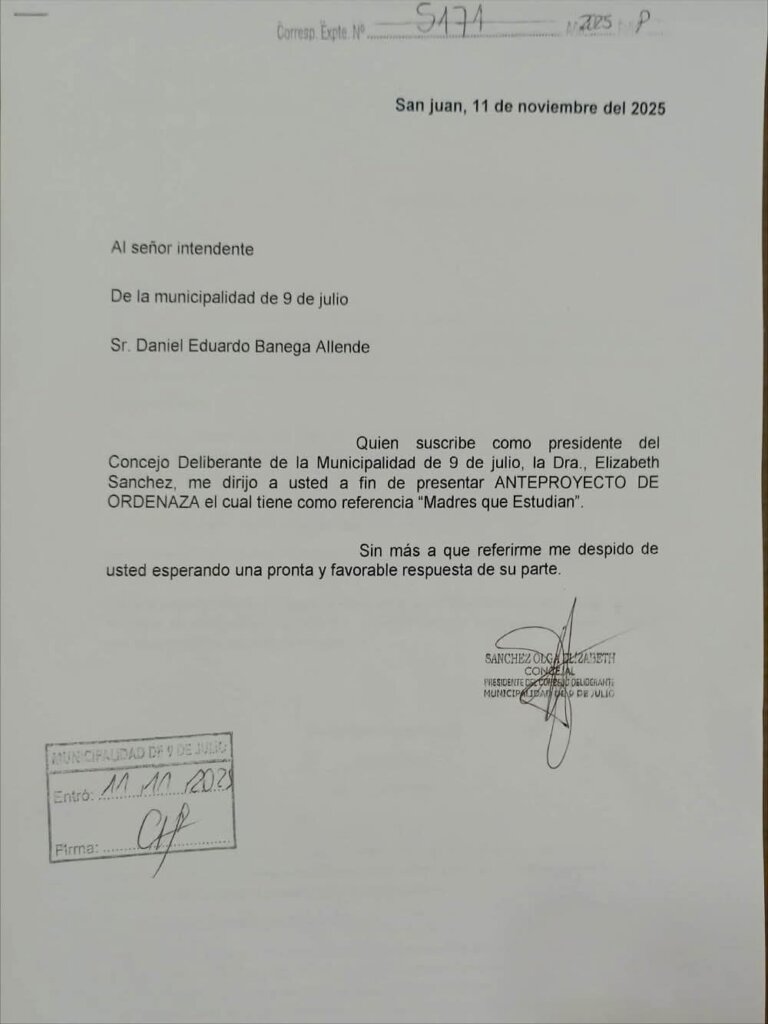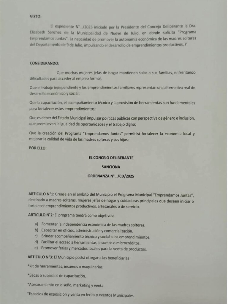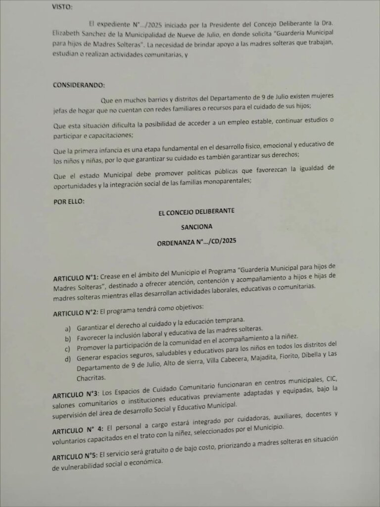 “Guardería Municipal para hijos de madres solteras”EXPEDIENTE N•5169Este tercer anteproyecto surge como un complemento esencial de los anteriores, buscando garantizar un espacio seguro, afectivo y educativo para los hijos e hijas de madres/jefas de familia mientras ellas desarrollan actividades laborales, educativas o comunitarias. La guardería se proyecta como un lugar de cuidado, contención y aprendizaje, donde cada niño y niña pueda crecer en un entorno de amor y respeto.Dicho proyecto será llevado a cabo por personal capacitado del departamento, maestras jardineras, auxiliares, asistentes sociales, etc.Cabe destacar que estas iniciativas son aplicables a todos los distritos del departamento de 9 de Julio (La Majadita, Villa Cabecera, Dibella, Las Chacritas, Alto de Sierra y Fiorito), fortaleciendo así una mirada integral y territorial que garantice igualdad de oportunidades para todas las mujeres, sin importar dónde vivan.