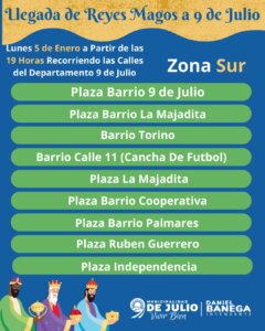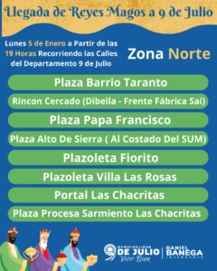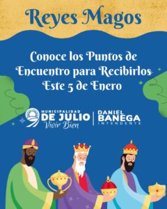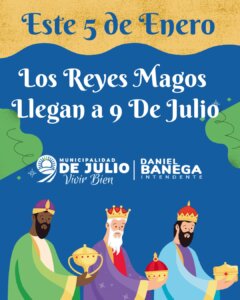 La Municipalidad de 9 de Julio invita a todas las familias del departamento a vivir hoy lunes 5 de enero una tarde/noche llena de ilusión con la llegada de los Reyes Magos, a partir de las 19:00 horas.