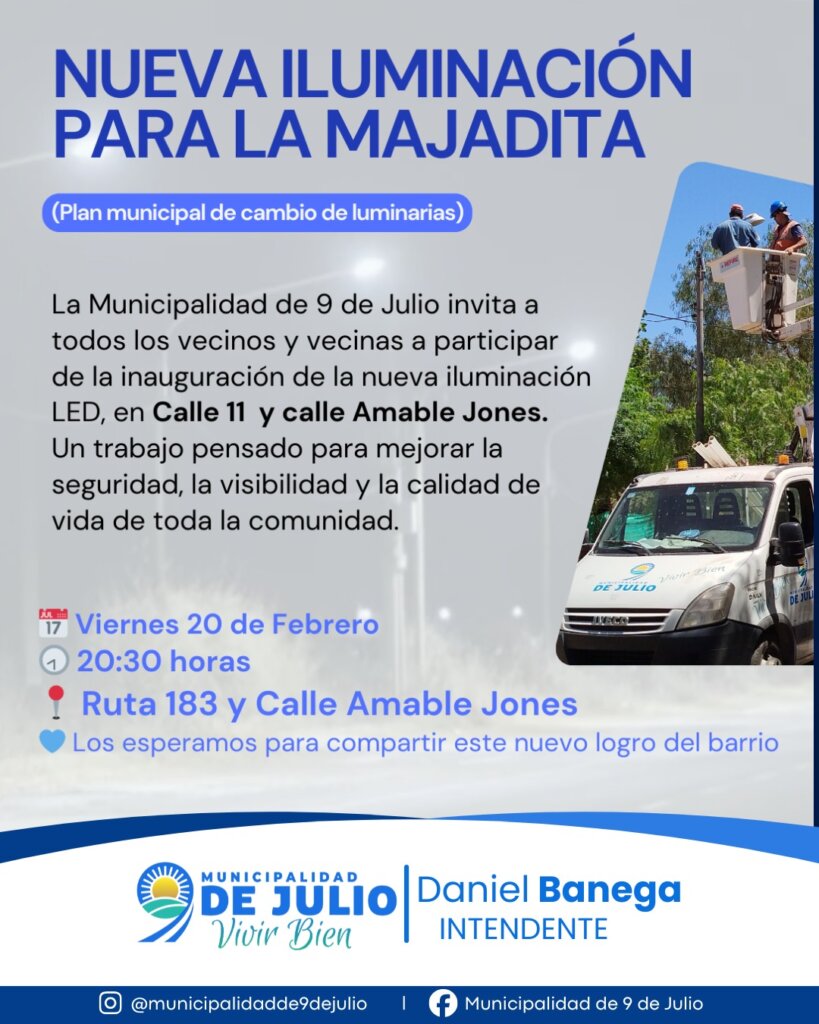 La Municipalidad de 9 de Julio invita a los vecinos a la inauguración de las nuevas luminarias LED en la zona de Calle 11 y calle Amable Jones, en La Majadita, en el marco de la continuidad del plan municipal de nueva iluminación en todo el departamento.