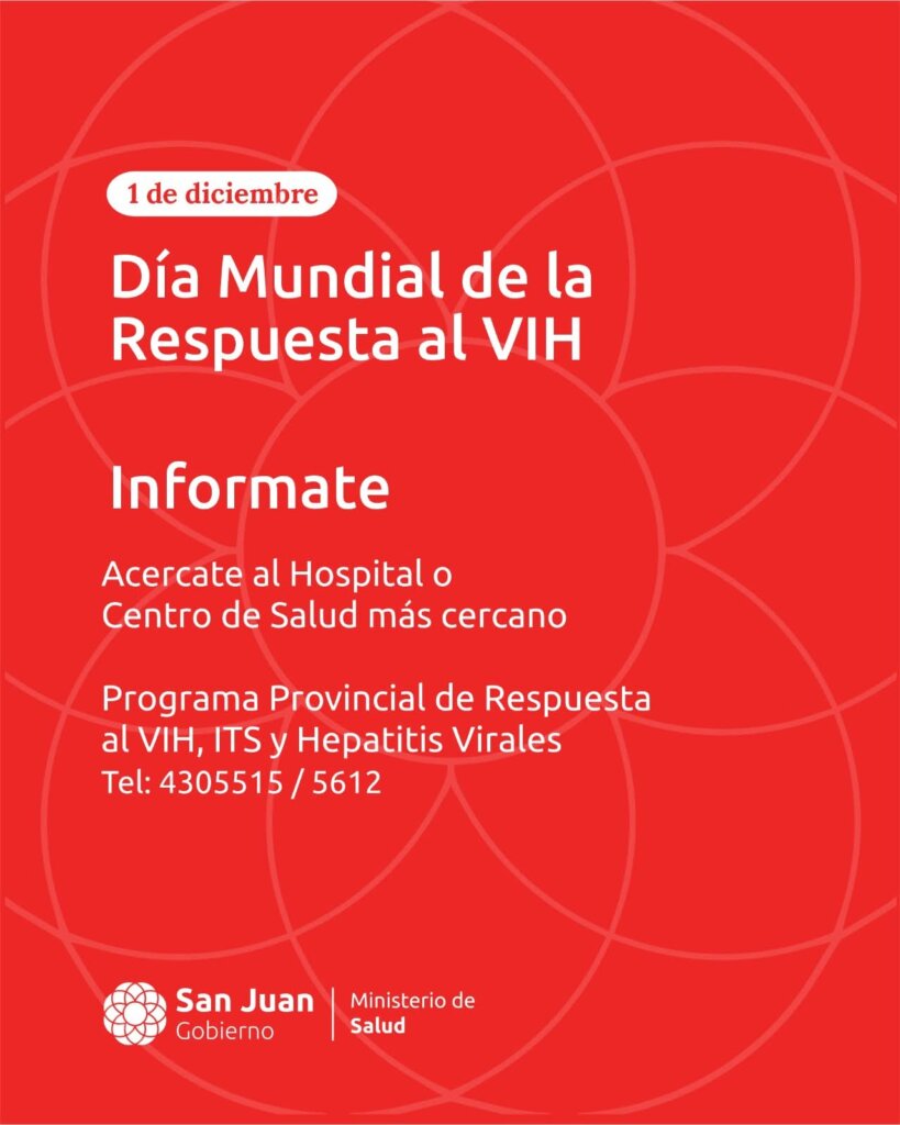 En el marco del Día Mundial de Respuesta al VIH, el sistema de Salud de San Juan organizará una jornada especial de testeos rápidos y gratuitos para VIH, sífilis y hepatitis este lunes 1 de diciembre. La actividad se desarrollará sin requisito de obra social ni solicitud médica, dirigida a toda la comunidad.