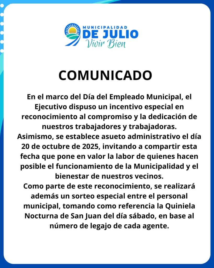 Pasaron el día para el próximo lunes 20 donde la municipalidad les brindará el asueto correspondiente y se les acreditara un bono de $40 mil pesos a los plantas permanente y $30 mil pesos para los becados, sumado a 4 bicicletas que serán por sorteo de la quiniela de San Juan 2 para los plantas permanente y 2 para becados, también se tiene en cuenta que el sueldo de el empleado municipal de 9 de julio es superior a cualquier municipalidad de segunda categoría.
