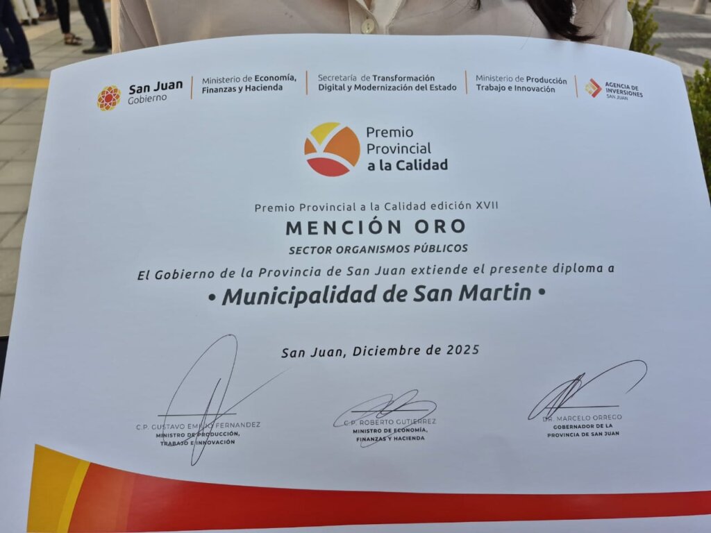 La Municipalidad de San Martín volvió a destacarse a nivel provincial al ser reconocida, por quinto año consecutivo, en el Premio Provincial a la Calidad. Esta distinción reafirma un camino de trabajo sostenido basado en la mejora continua, la eficiencia, la eficacia y la transparencia en los procesos administrativos y en el manejo de los fondos públicos.