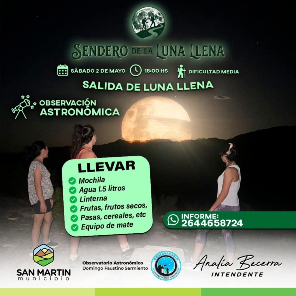 El Municipio de San Martín invita a vivir una experiencia única bajo el cielo nocturno, en una nueva edición del Sendero de la Luna Llena. Una propuesta que combina caminata, naturaleza y observación astronómica, ideal para disfrutar en familia o con amigos.